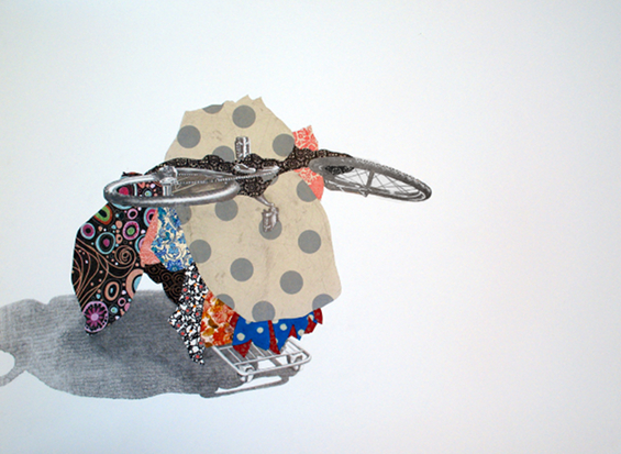 Inspired by her Oakland surroundings and the mysterious life of collected objects (from homeless shopping carts to a public disposal & recycling area), Amy Wilson Faville collages her own drawings in with an assortment of vibrant materials such as old mattress fabric, file folders, vintage wallpaper, and other scraps. Comparable to quilt-making, Faville’s compositions incorporate consistent patterns with eclectic pops of color, conceptually mirroring her subject matter.